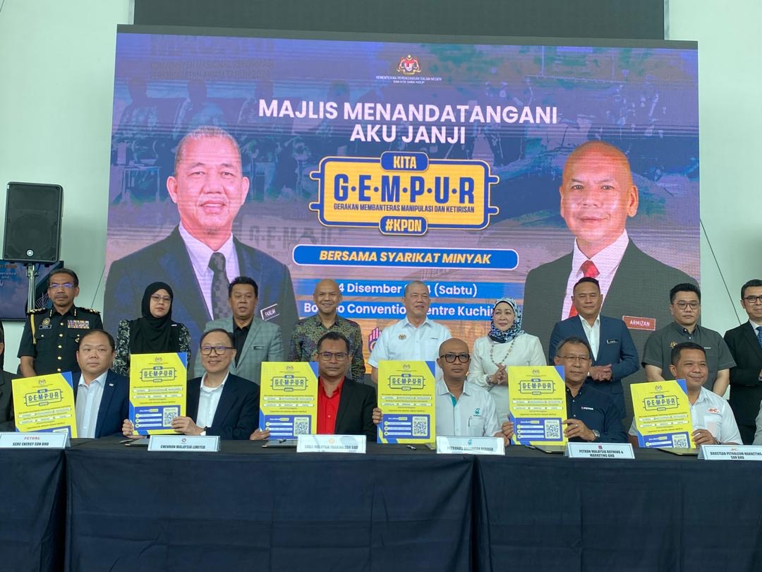 KUCHING: Sebanyak 11 syarikat minyak yang merupakan rakan strategik Kementerian Perdagangan Dalam Negeri dan Kos Sara Hidup (KPDN) menandatangani ’Aku Janji’ KITA GEMPUR, hari ini.