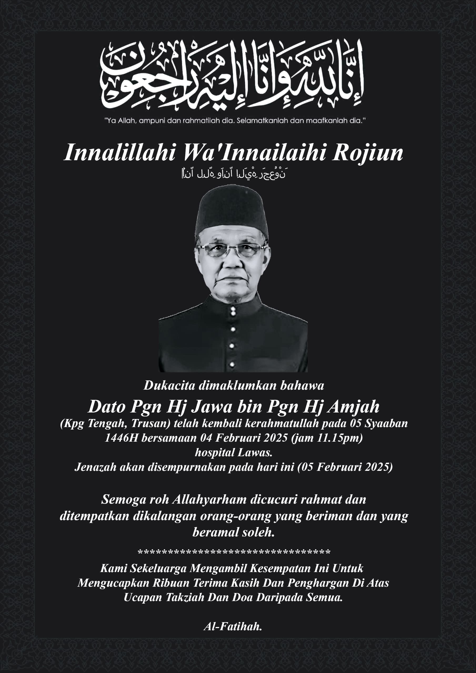 LAWAS: Bekas pengasas Parti Pesaka Bumiputera Bersatu(PBB) daerah Lawas Dato Pengiran Jawa Pengiran Amjah kembali ke rahmatullah malam tadi.