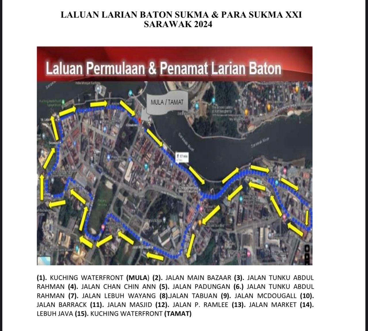 KUCHING: Beberapa jalan utama di Kuching akan ditutup secara berperingkat Ahad ini sempena Larian Baton Sukma dan Para Sukma XXI 2024.