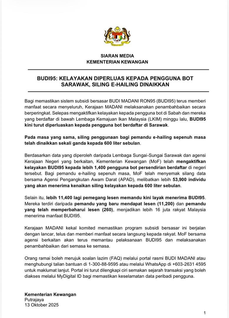 Dalam masa sama, kerajaan turut mengumumkan peningkatan siling penggunaan petrol bagi pemandu e-hailing sepenuh masa kepada 600 liter sebulan berbanding 300 liter sebelum ini, sebagai langkah membantu meringankan kos operasi.