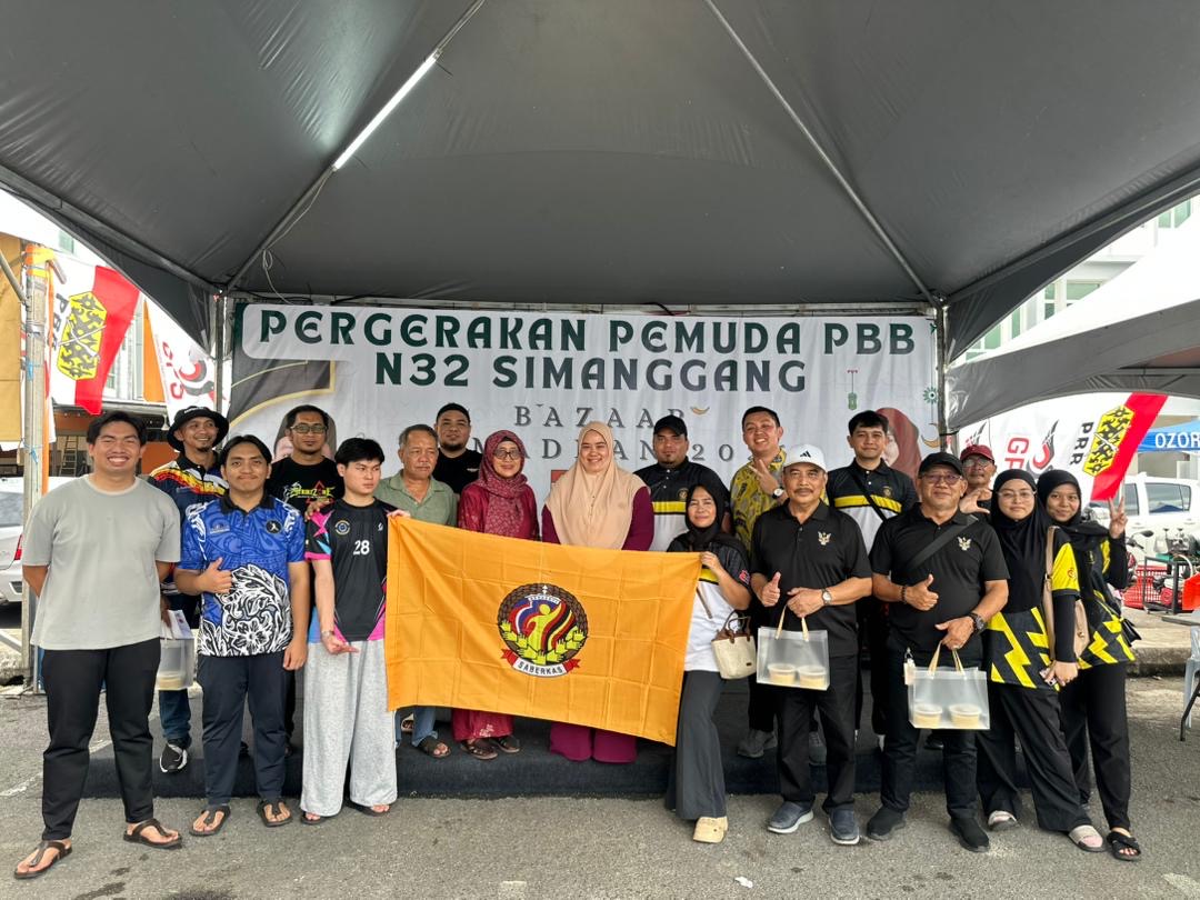 SIMANGGANG: Pertubuhan Belia Kebangsaan Bersatu Sarawak (SABERKAS) Cawangan Lingga mengagihkan 1,000 pek bubur lambuk kepada pengunjung Bazar Ramadan Pergerakan Pemuda Parti Pesaka Bumiputera Bersatu (PBB) Simanggang di Pasar Tamu Baru, semalam.