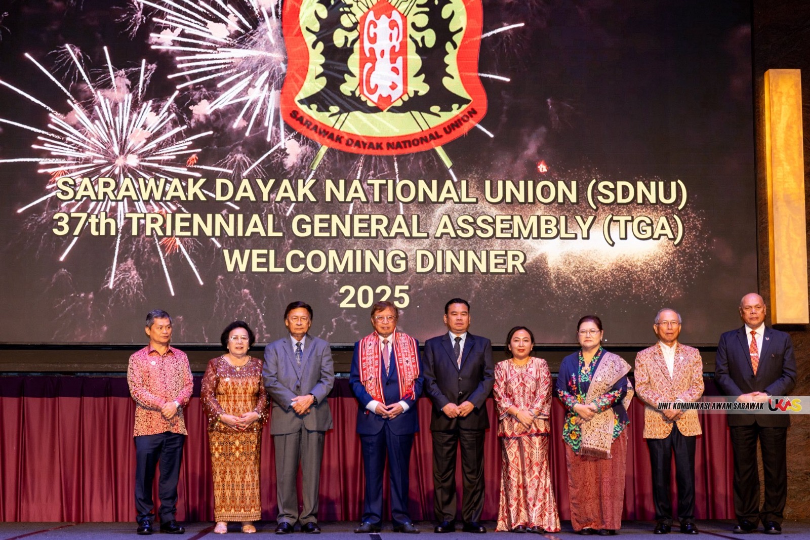 Turut hadir, Presiden SDNU merangkap Penasihat di Pejabat Premier Sarawak (Industri Makanan, Komoditi dan Pembangunan Wilayah) Tan Sri Dato Sri William Mawan Ikom, Timbalan Presiden SDNU merangkap Pengerusi Pengelola majlis Ir Cristopher Gira Sambang, Naib Presiden Kanan SDNU Leftenan Jeneral (R) Datuk Stephan Mundaw, Pengerusi Serakup Indu Dayak Sarawak (SIDS) Dato Alice Jawan. – UKAS