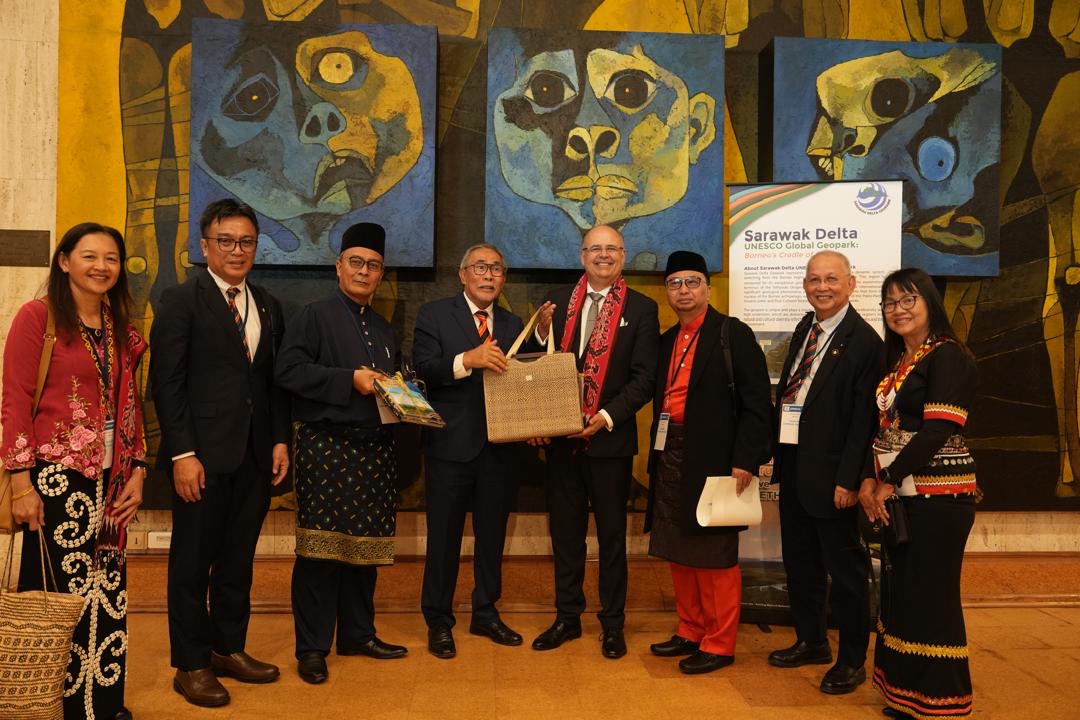 Timbalan Menteri Perancangan Bandar, Pentadbiran Tanah dan Alam Sekitar, Datuk Len Talif Salleh mengetuai delegasi Sarawak untuk menerima sijil berkenaan disampaikan Ketua Seksyen Sains Bumi dan Geopark UNESCO, Kristof Vandenberghe.