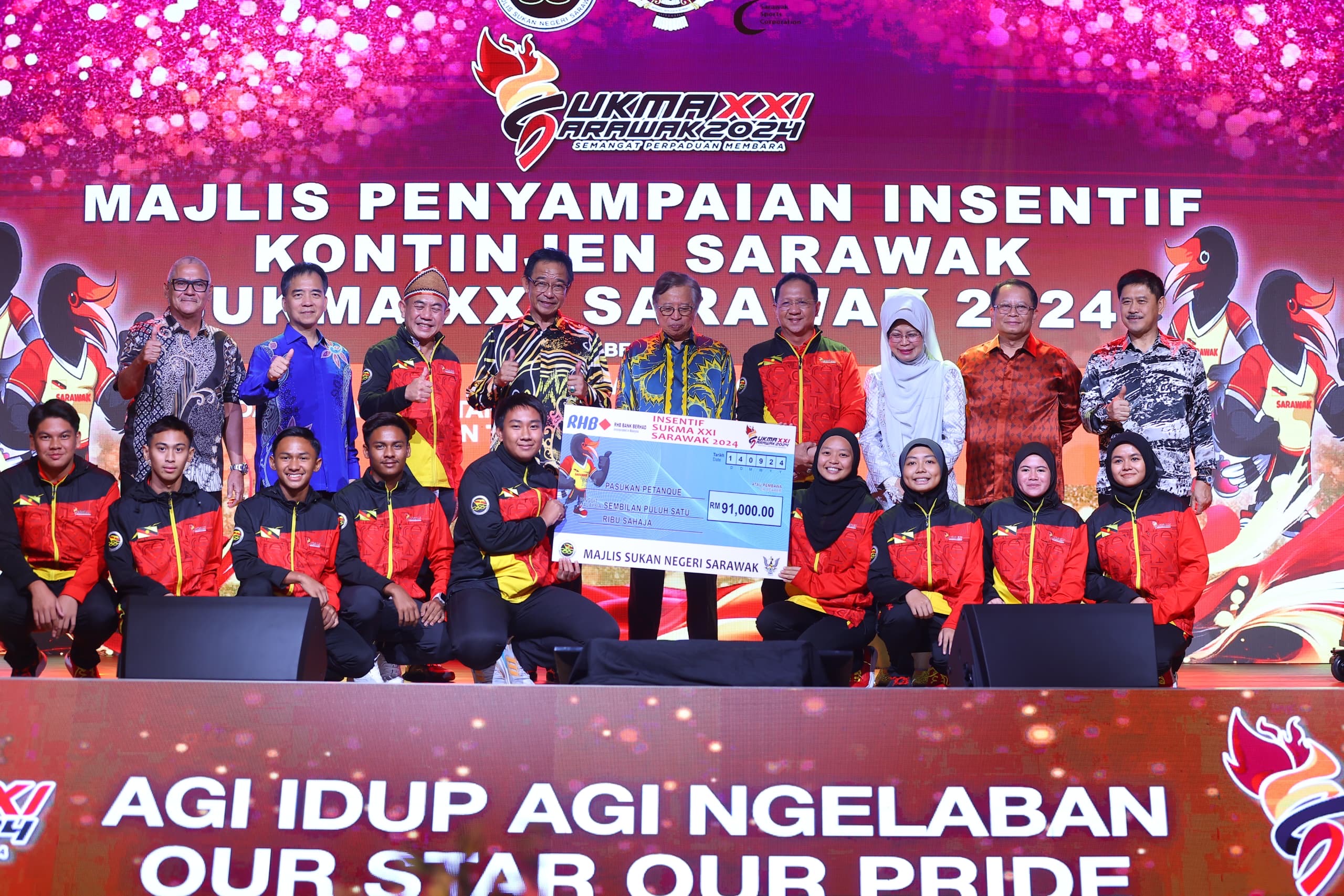 menyampaikan insentif keseluruhan berjumlah RM1,834,000 kepada semua atlet Sarawak yang memenangi pingat